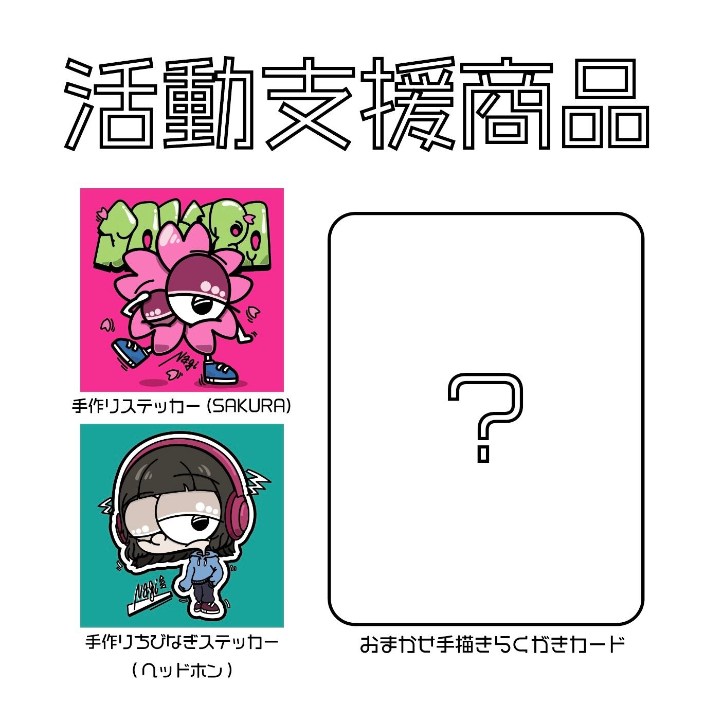 ③手作りステッカー(SAKURA)&手作りちびなぎステッカー(ヘッドホン)&おまかせ手描きらくがきカード